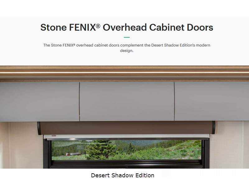 - Desert Shadow Edition Décor Package – Includes Alcoa Aluminum Wheels (6) with Black Finish, Desert Shadow Badge, Black Exterior Badging & Assist Handle, Black Tail Light Bezels, Black Interior Fixtures & Hardware, Black Grille, Stone Overhead Cabinets & Backsplash