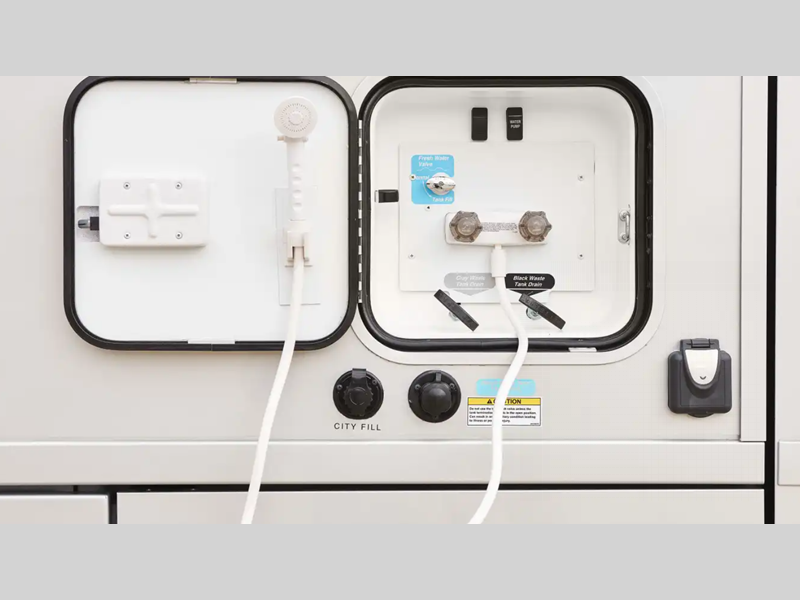 - Service center houses color-coded labels, pressurized city water hookup/tank diverter valve, drainage valves, exterior wash station w/lighted pump switch